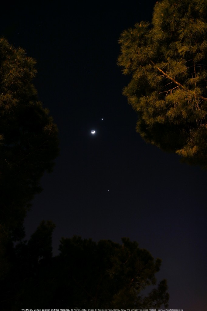 This wonderful “meeting among the Moon, Venus and Jupiter happened on 26 March 2012. Pleiades are also easily visible. This image was grabbed by Gianluca Masi from Rome, Italy, using a 55/f2.8 lens.