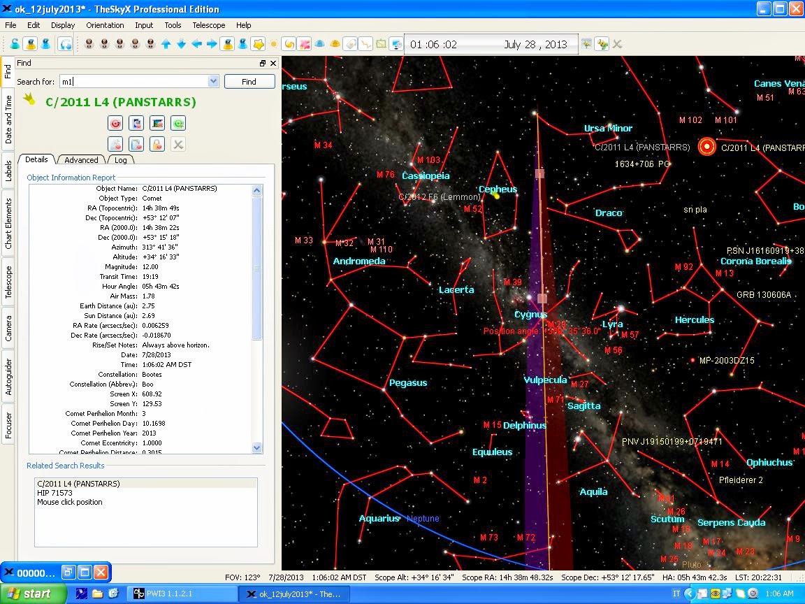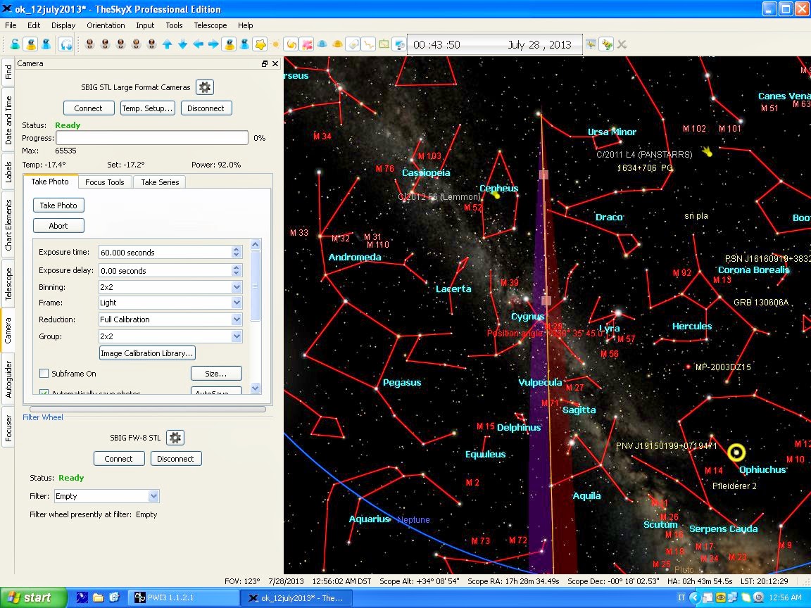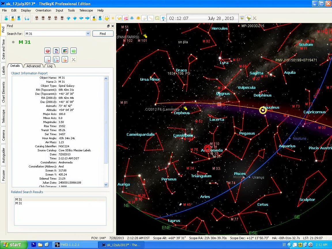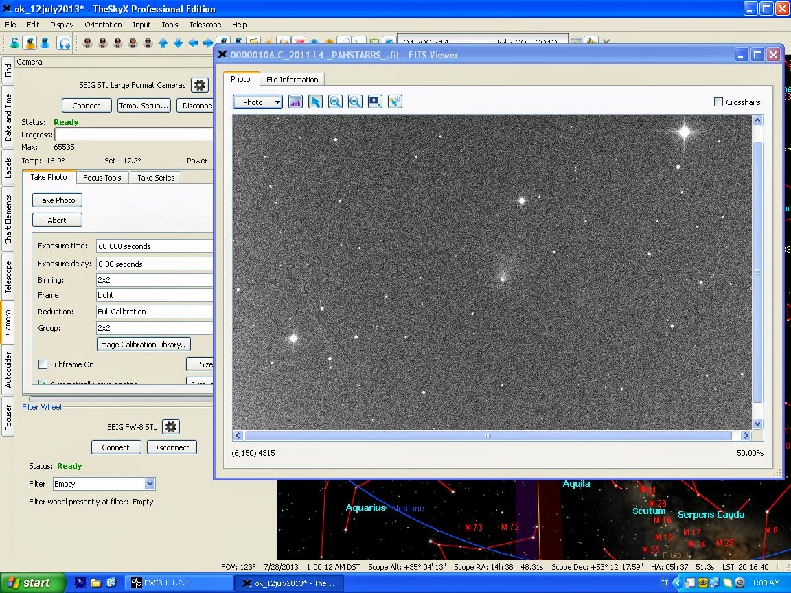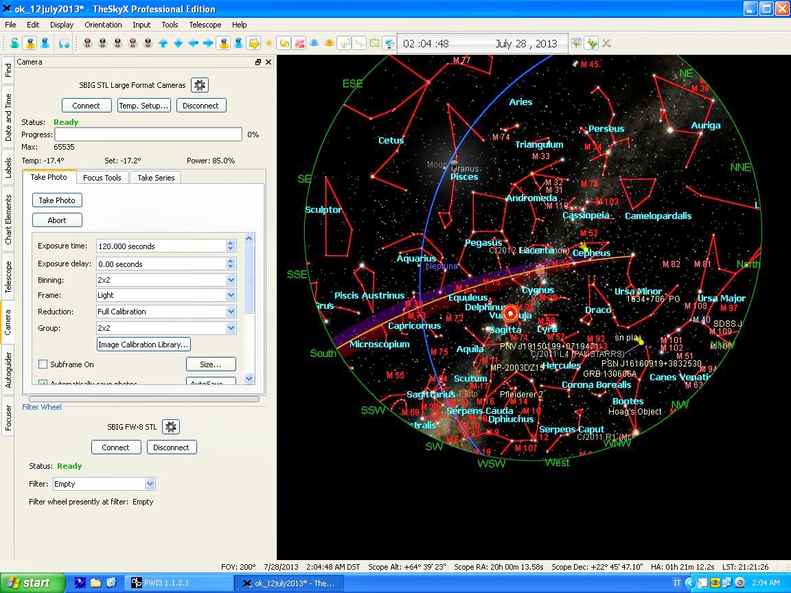 The 27 Jul. 2013, at 22:45 UT the trip started, under excellent sky in Ceccano, Italy, where the Virtual Telescope facility in installed. We used the PlaneWave 17″ robotic unit.