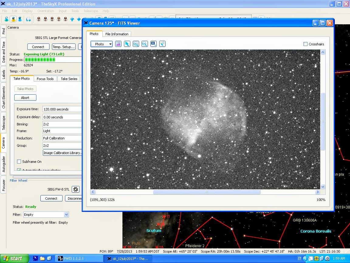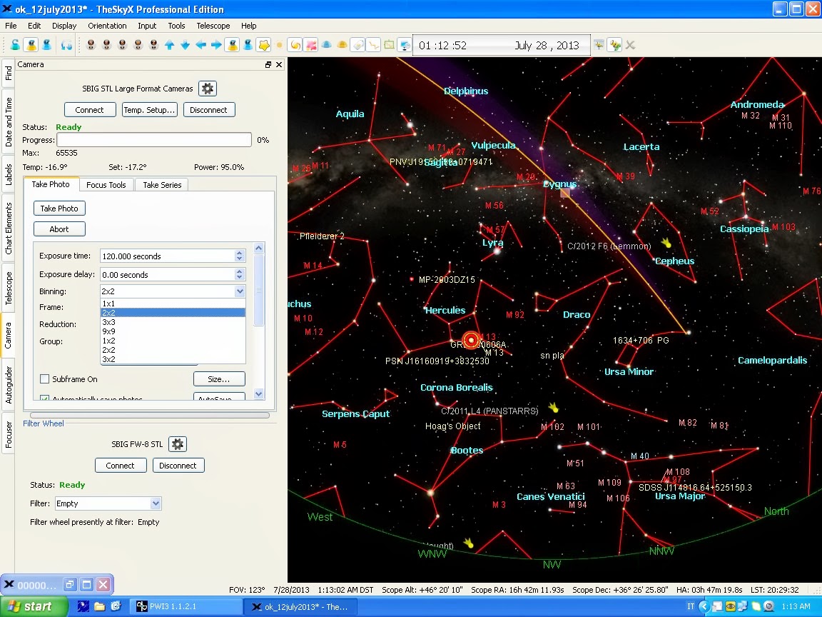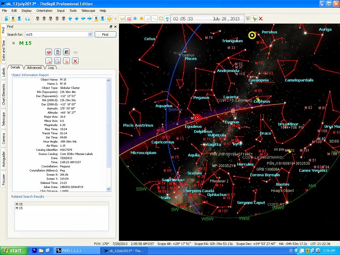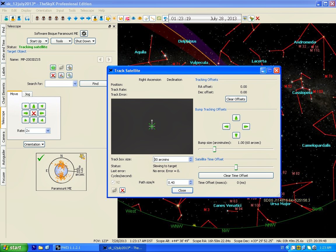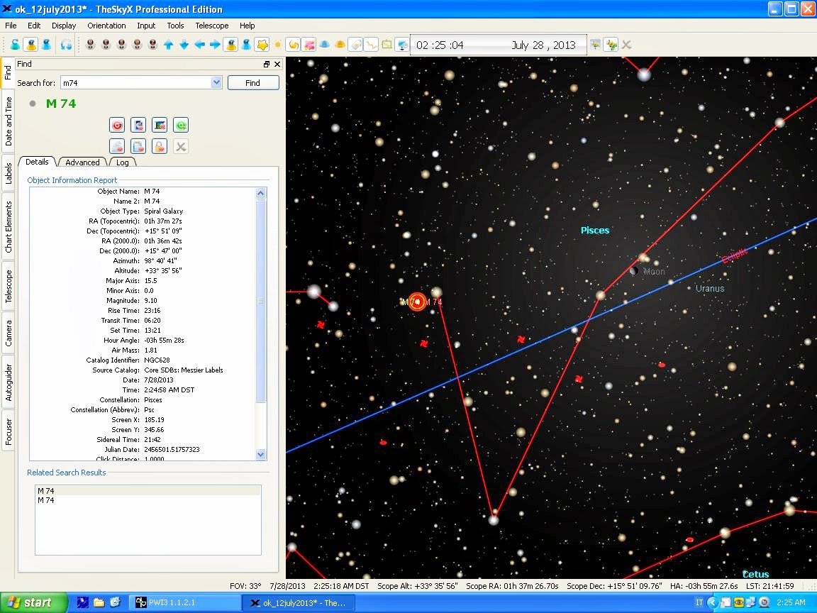 The 27 Jul. 2013, at 22:45 UT the trip started, under excellent sky in Ceccano, Italy, where the Virtual Telescope facility in installed. We used the PlaneWave 17″ robotic unit.