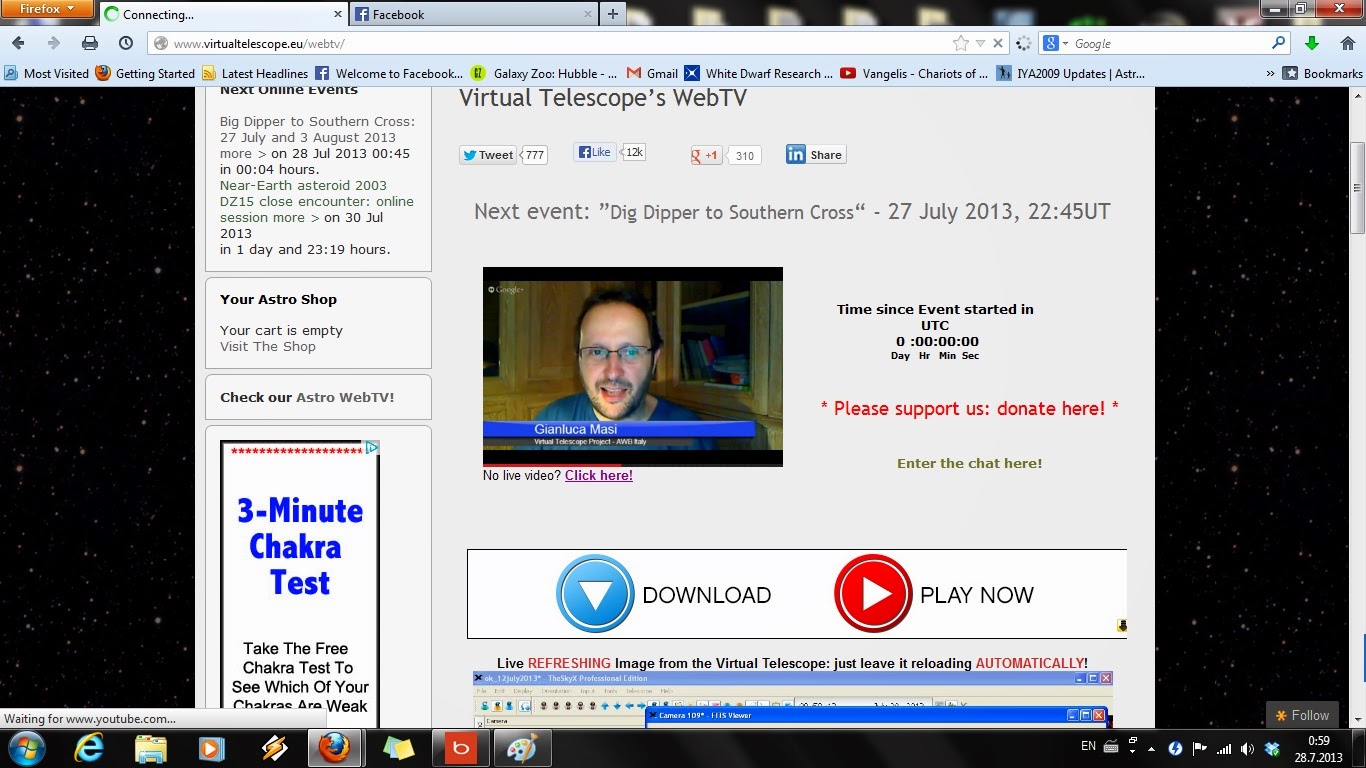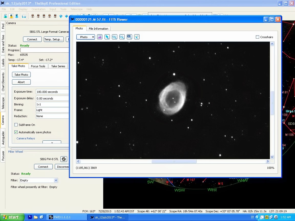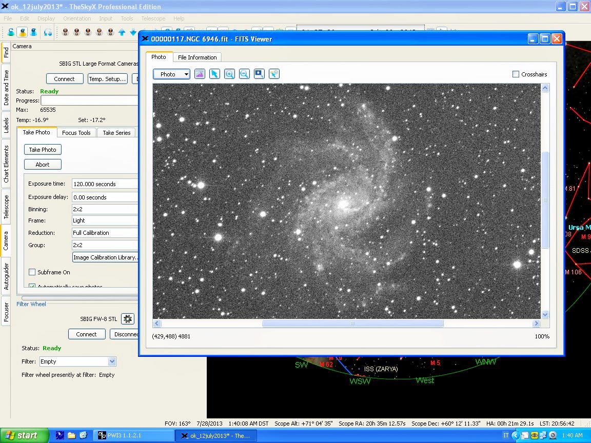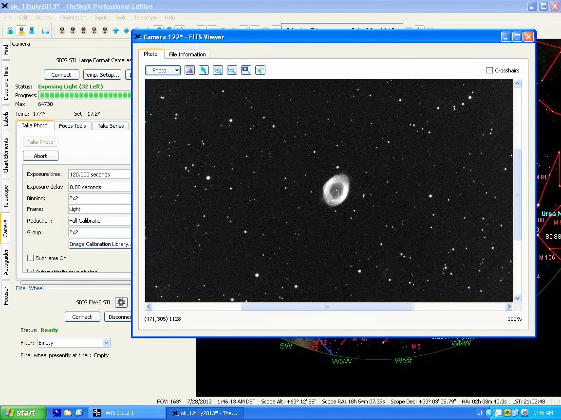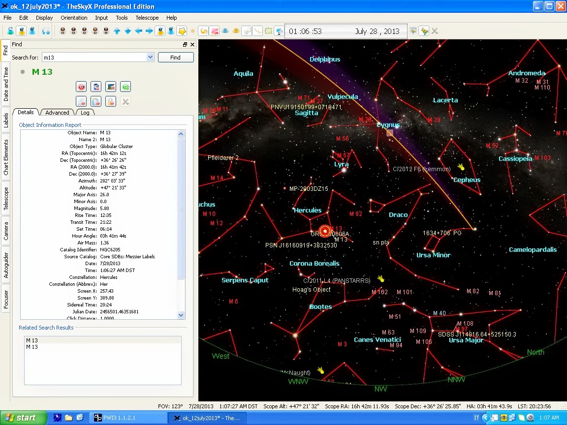 The 27 Jul. 2013, at 22:45 UT the trip started, under excellent sky in Ceccano, Italy, where the Virtual Telescope facility in installed. We used the PlaneWave 17″ robotic unit.