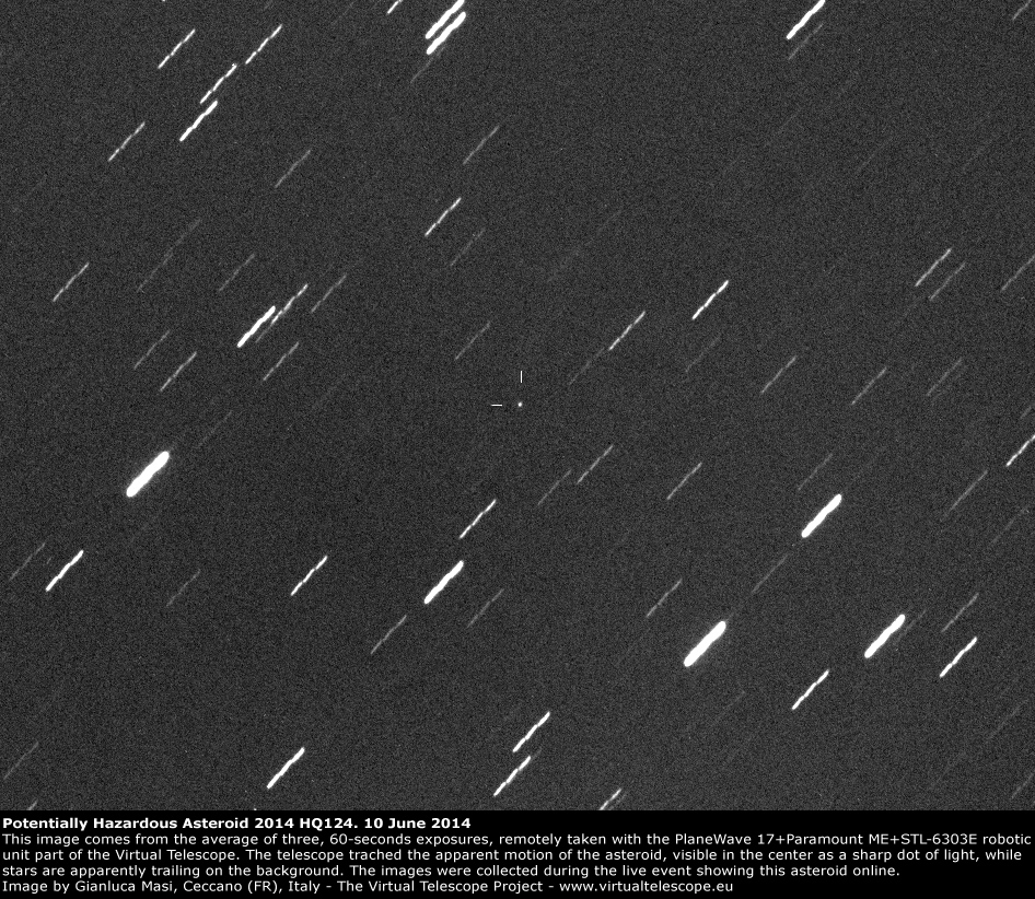 On 10 June 2014 at Virtual Telescope we shared live, online, the potentially hazardous asteroid 2014 HQ124, a couple of days after its close encounter with the Earth. The session was a big success, with the asteroid beautifully visible and perfectly tracked by our systems.