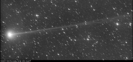 The image above comes from the average of 5, 180-seconds exposures, remotely taken with the 17″ robotic unit part of the Virtual Telescope. The telescope’s mount tracked the apparent motion of the comet. At the imaging time, the comet was at less than 40 degrees above the horizon, but the sky was very clear and the ion tail is amazingly well visible, with many intriguing details.