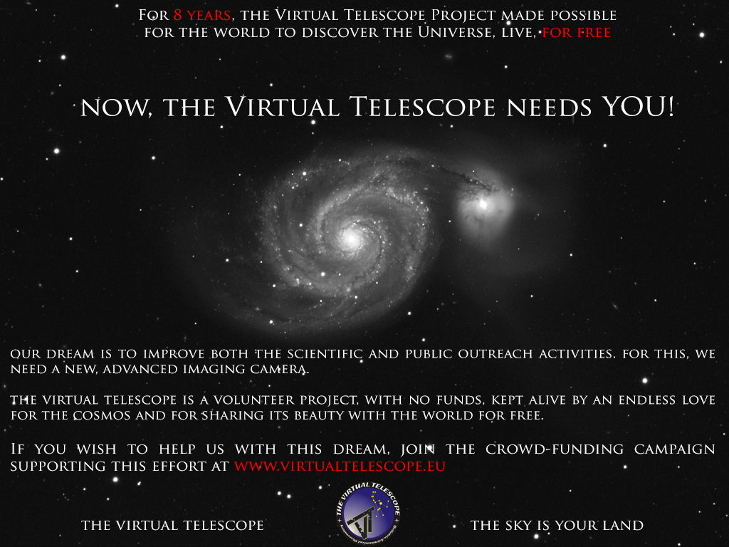 We want to reach our goal, for this we need your help. We are used to challenges. The Virtual Telescope Project, because of the lack of funding, has been itself a challenge. But history says it is today one of the most important facilities of its kind in the world, Guess what we can do with your help. Make this dream real, support of campaign.