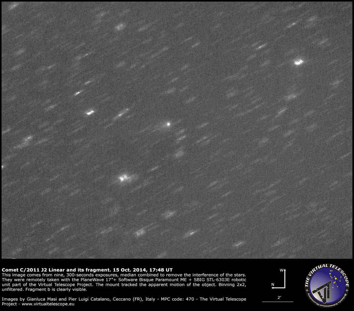 The image above comes from nine, 300-seconds unfiltered exposures, remotely collected with the PlaneWave 17″+Paramount ME+SBIG STL-6303E robotic unit part of the Virtual Telescope Project. They were combined using a median technique, to limit the potential interference of faint stars with the fragment. Fragment b confirms to be fainter. The telescope tracked at the apparent rate of the comet.
