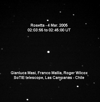 The static image above is a composition made with all the frames where Rosetta was visible: the spacecraft is the bright point of light apparently tracing a dotted line. A careful inspection shows that the path is not a perfectly linear, because of parallax effect due to the very close distance of the object: quite an interesting document!