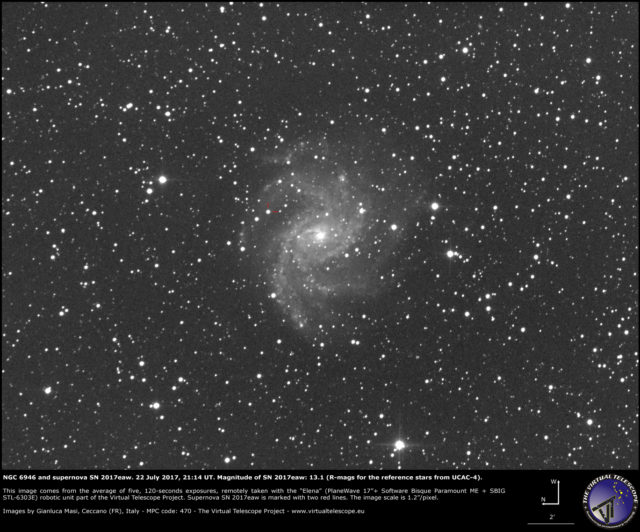 We managed to measure the brightness of SN 2017eaw, finding it at mag. 13.1 (unfiltered, R-mags for the reference stars from UCAC-4), suggesting the transient is now fading. Of course, we need more observations to confirm this. Luckily, the object will be visible for many months. In more than two months since its discovery (14 May), this supernova spent most of its time close to mag. 13 in brightness, the so-called “plateau”. It is worth to note that the lightcurve is color-dependent. In the B (blue) band, the star has been fading soon after its maximum. You can check the AAVSO website for a complete lightcurve