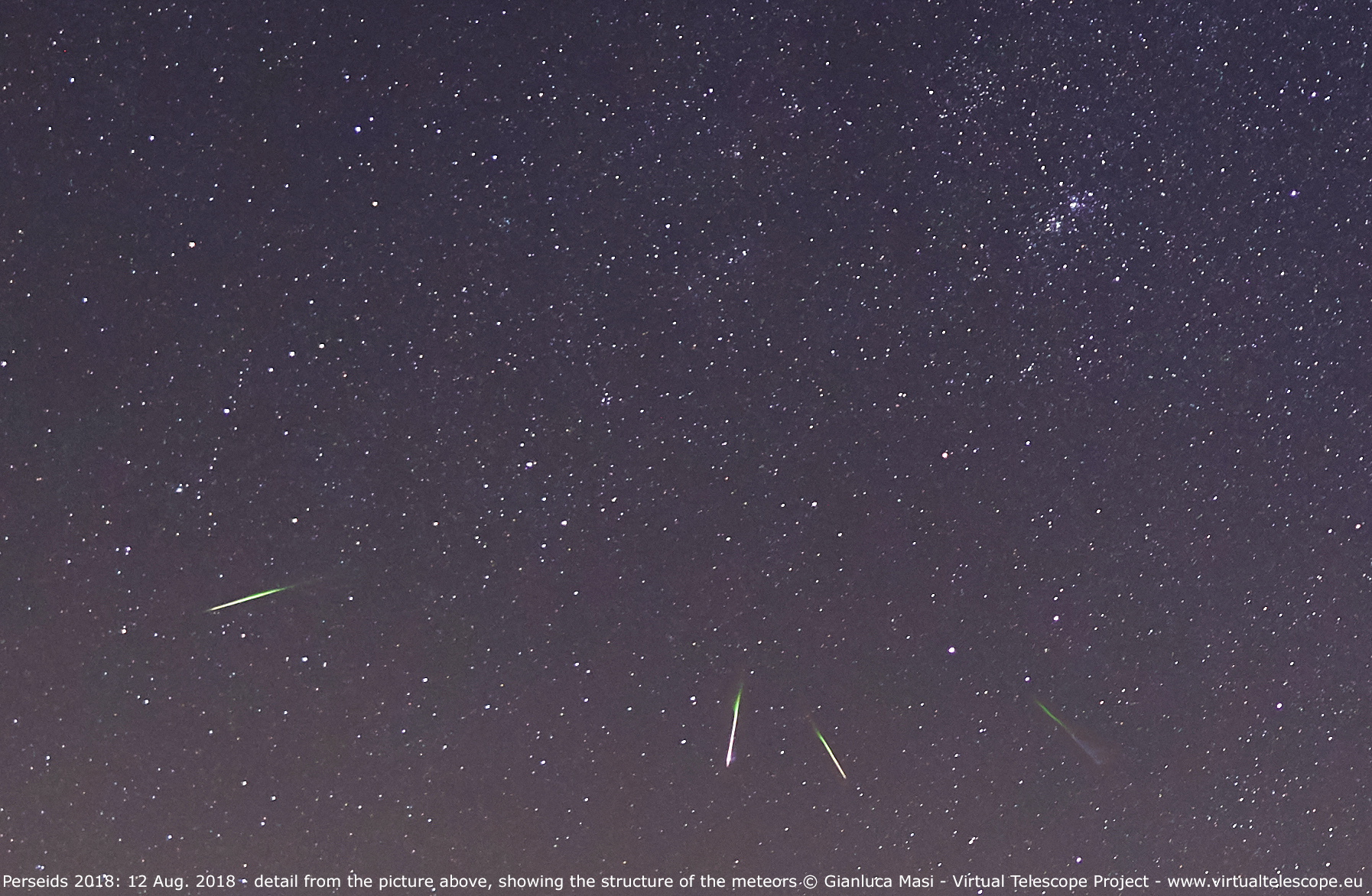 The image above shows the meteor streaks in some details, with their very beautiful colors: on the upper right, you can see the famous “Double Cluster” in Perseus, not far from the radiant, the point from where the meteors trail are apparently coming.