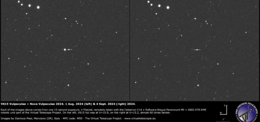 The image above comes from the average of three, 180-seconds exposures, unfiltered, remotely collected with the “Elena” (PlaneWave 17″+Paramount ME+SBIG STL-6303E) robotic unit part of the Virtual Telescope Project. V339 Del was estimated to be at mag. 15.2 (using R mags for the reference stars from UCAC 4), that is about two magnitudes fainter than 19 May 2015. V339 Del is in the center of the picture.