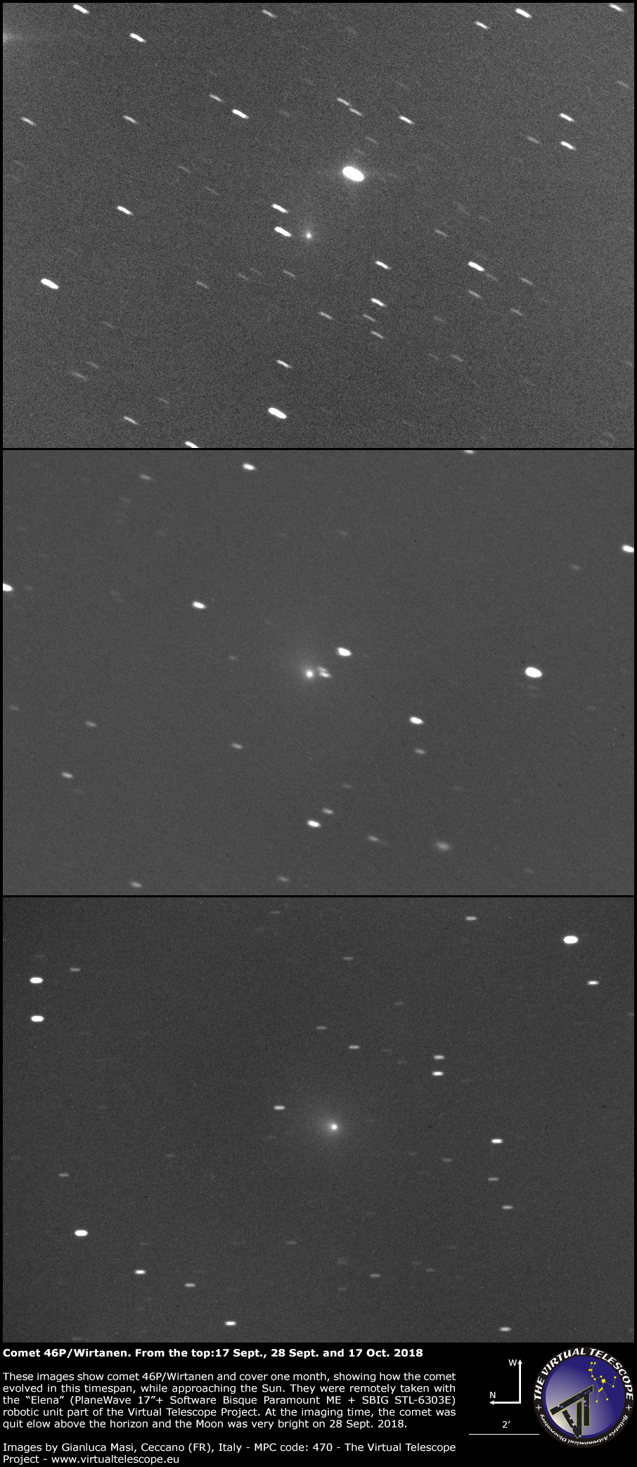 Images cover one month and they show how the comet evolved over that period of time, while approaching the Sun (perihelion is on 12 Dec. 2018, while it will reach the minimum distance from the Earth on 17 Dec. 2018, when it will be at 11.6 millions of km from us): we must say that at that time the object was very low above the horizon and this affected our observations. Plus, on 28 Sept., the Moon was almost full.
