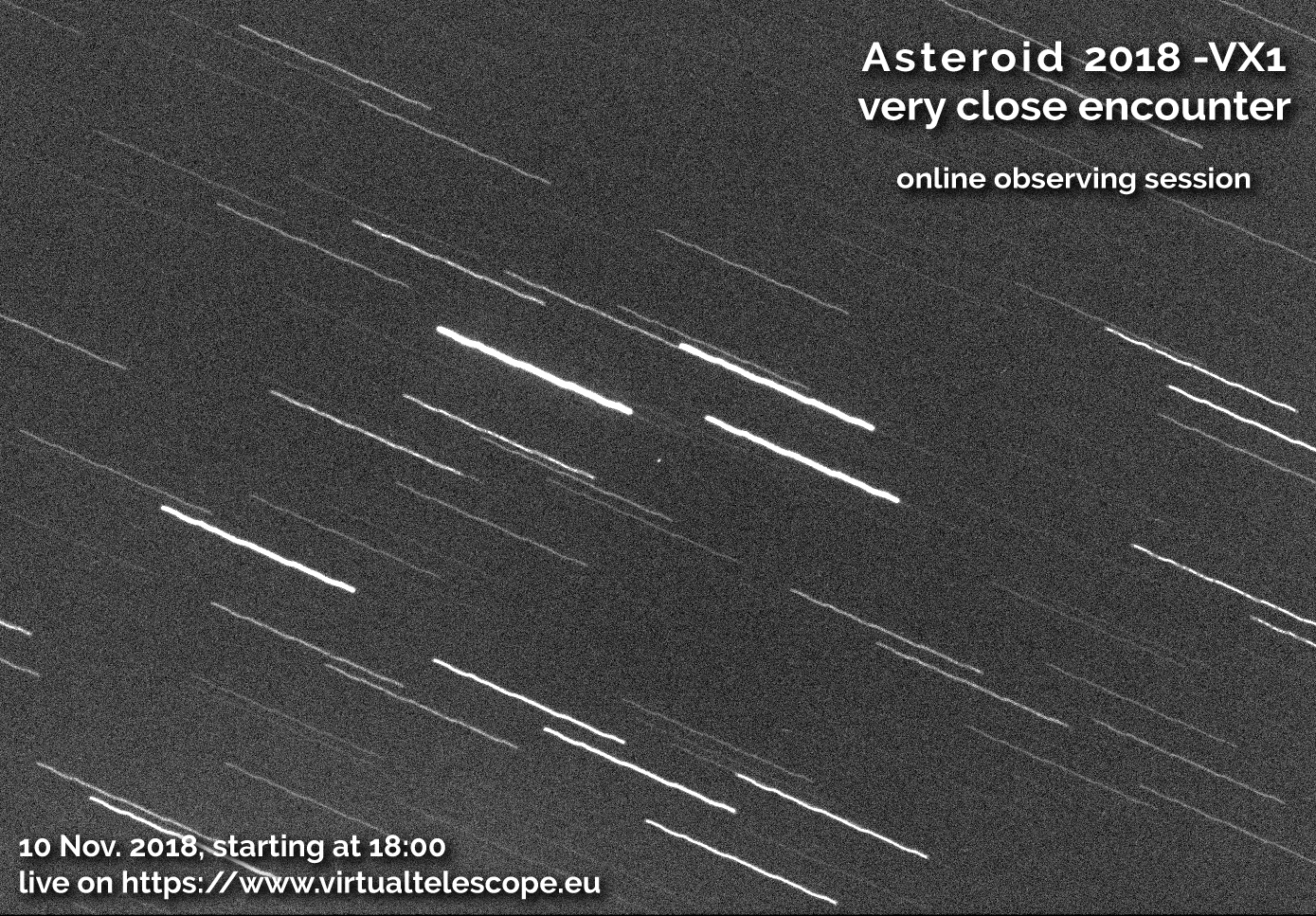 Next 10 Nov. 2018, the near-Earth Asteroid 2018 VX1 will have a very close, but safe, encounter with us, coming at about 380.000 km from the Earth, a bit closer than our Moon. The Virtual Telescope Project will show it to you live!