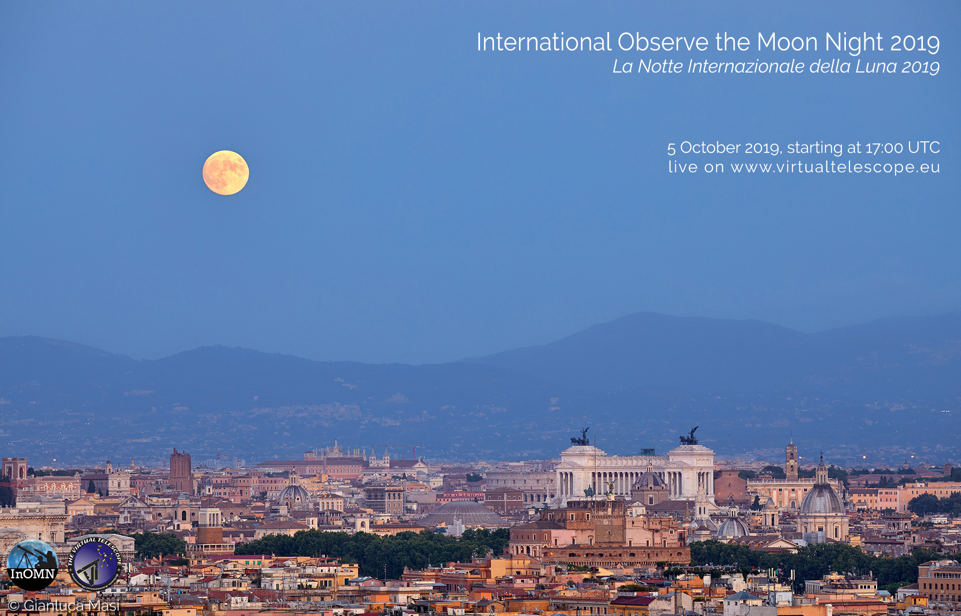 Next 5 Oct. 2019, the International Observe the Moon Night is back and it will be a special one. This year we celebrate the 50th Anniversary since the Apollo 11 historic landing and this will add a special flavor to the event. The Virtual Telescope Project will make possible for you to join InOMN 2019 online, live, from the comfort of your home, enjoying the Moon above the stunning skyline of Rome.