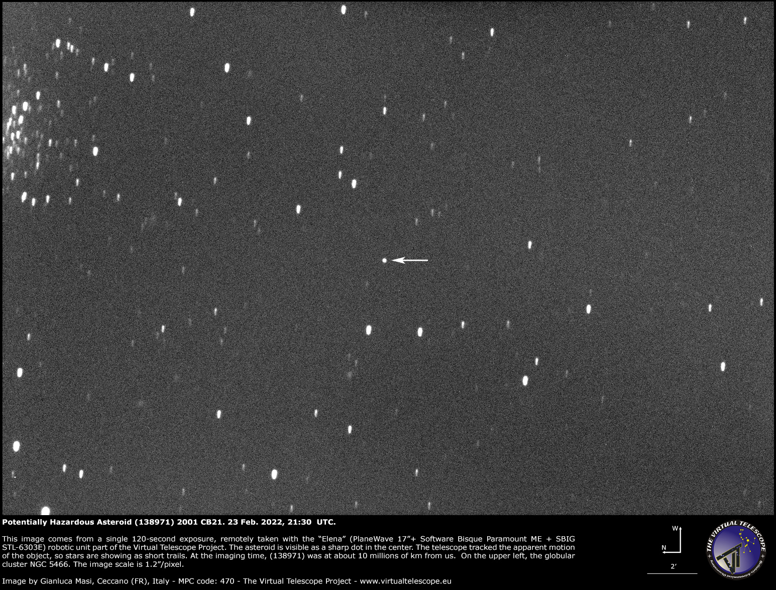 The image above comes from a single 120-second exposure, remotely taken with the “Elena” (PlaneWave 17″+Paramount ME+SBIG STL-6303E) robotic unit available at Virtual Telescope. The telescope tracked the apparent motion of the asteroid, so it looks like a sharp dot, with surrounding stars appearing slightly elongated. On the upper left, stars of the globular cluster NGC 5466 are also visible.