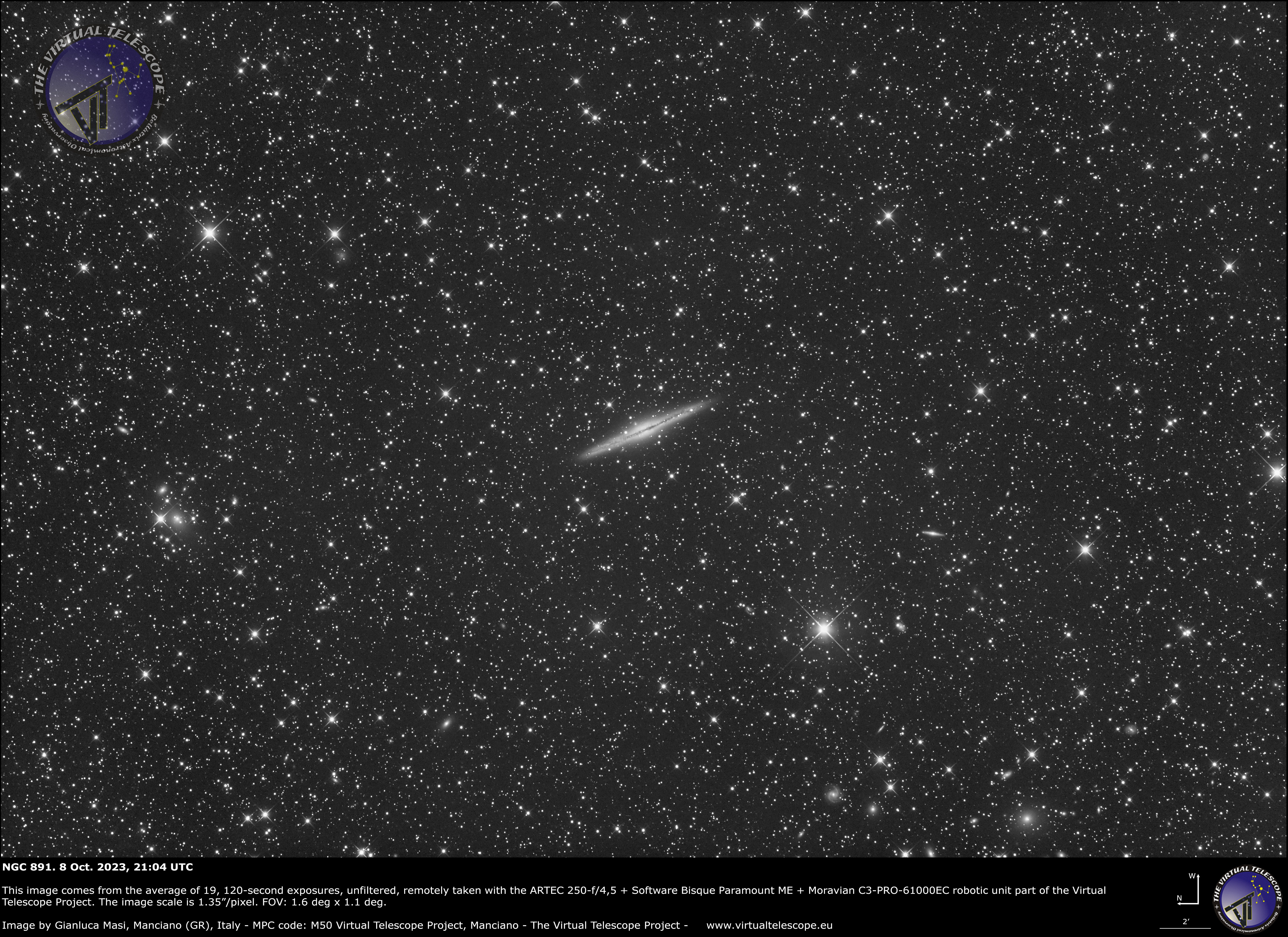 NGC 891 is one of the best examples of edge-on spiral galaxies. It was discovered by W. Herschel in 1784 and its distance is estimated in 30 million light years. The large field of view (1.9 deg. along the diagonals) covered by the image above contains many more small galaxies on the background.
