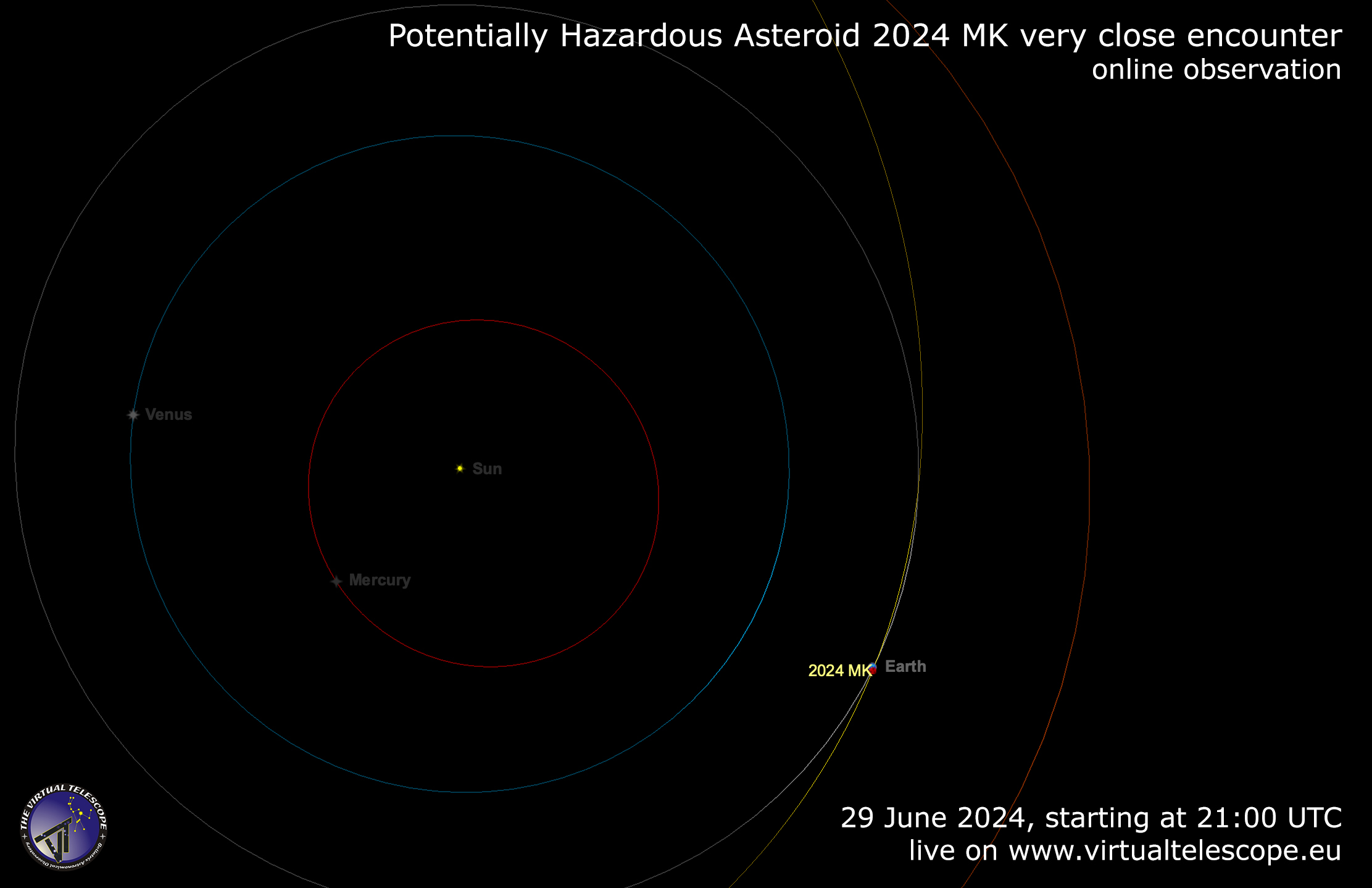 On 29 June 2024, the potentially hazardous asteroid 2024 MK will have a very close, but safe, encounter with us, coming at about 295000 km from the Earth, about 77% of the average lunar distance, becoming one of the brightest objects of its kind seen in recent history. The Virtual Telescope Project will show it to you live!