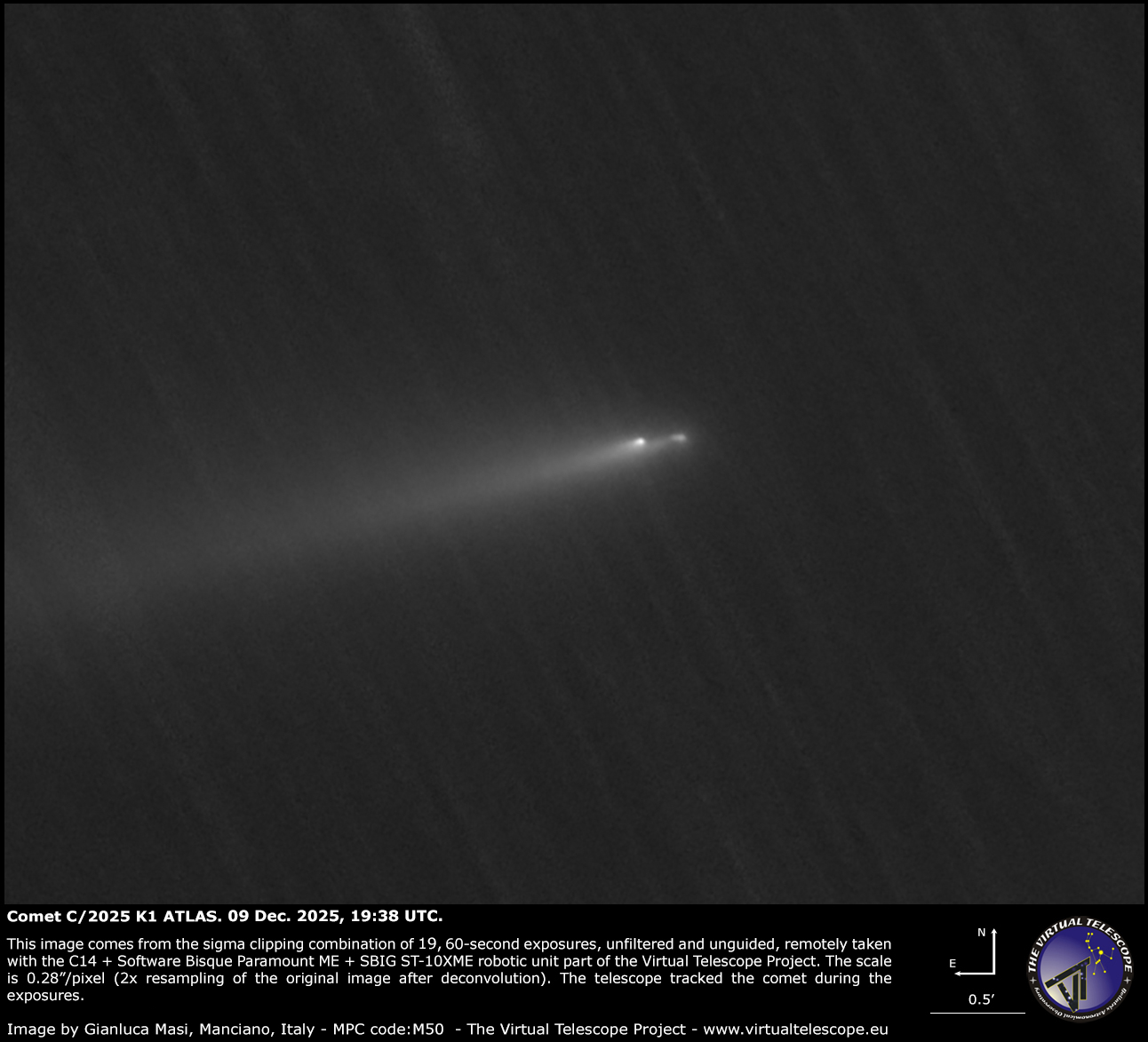 Our image shows something very similar to what was seen on 6 Dec. via the Gemini North 8.1-meter telescope. We spotted two fainter, leading fragments on the West and a bright, trailing one on the East, with what looks like a cloud of debris between them. While C/2025 K1 ATLAS is significantly fading, it remain a truly intriguing target.