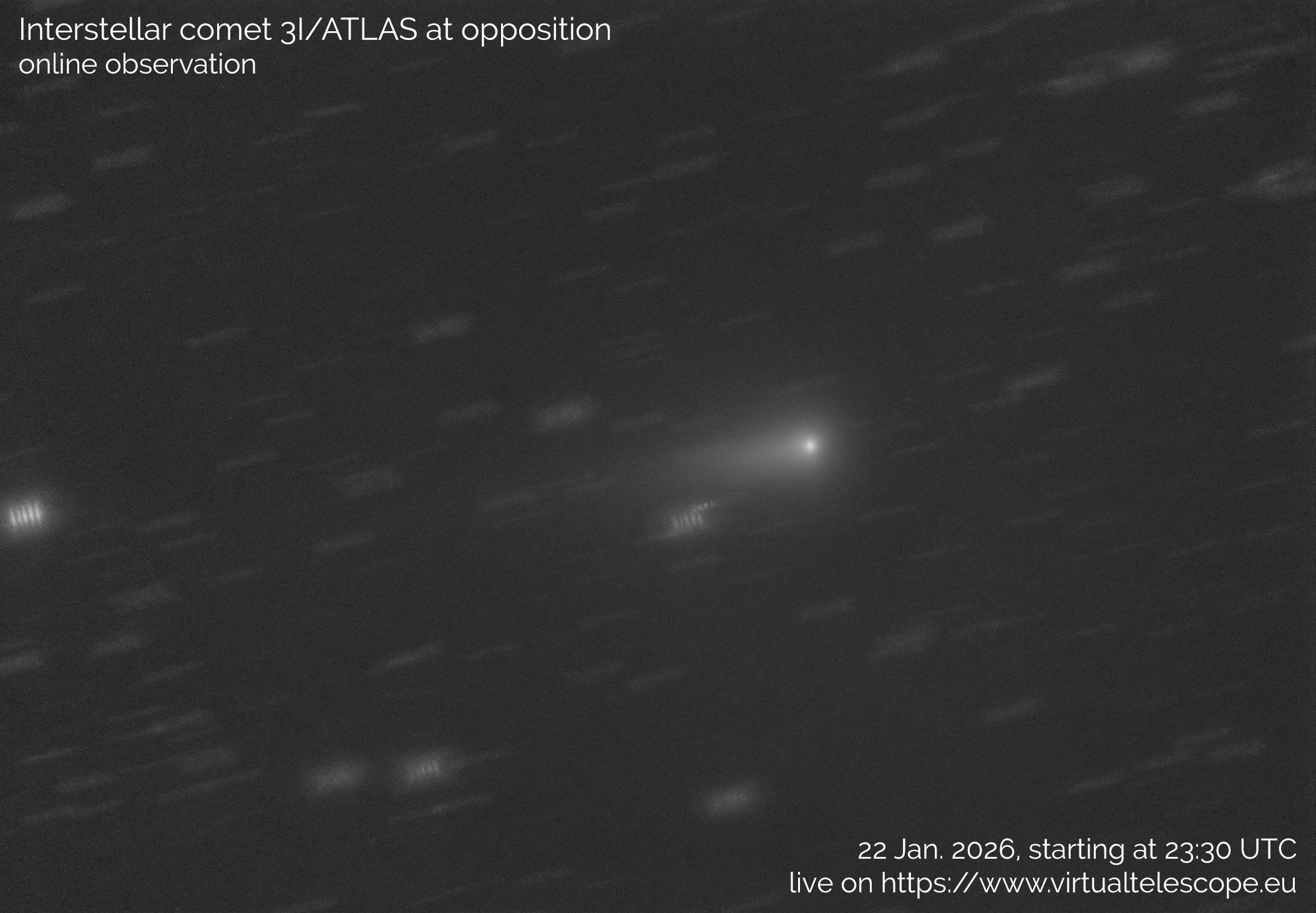 On Jan. 22, the interstellar comet 3I/ATLAS will be at opposition, visible in our sky in the direction opposite to the Sun. We will show it live, online.