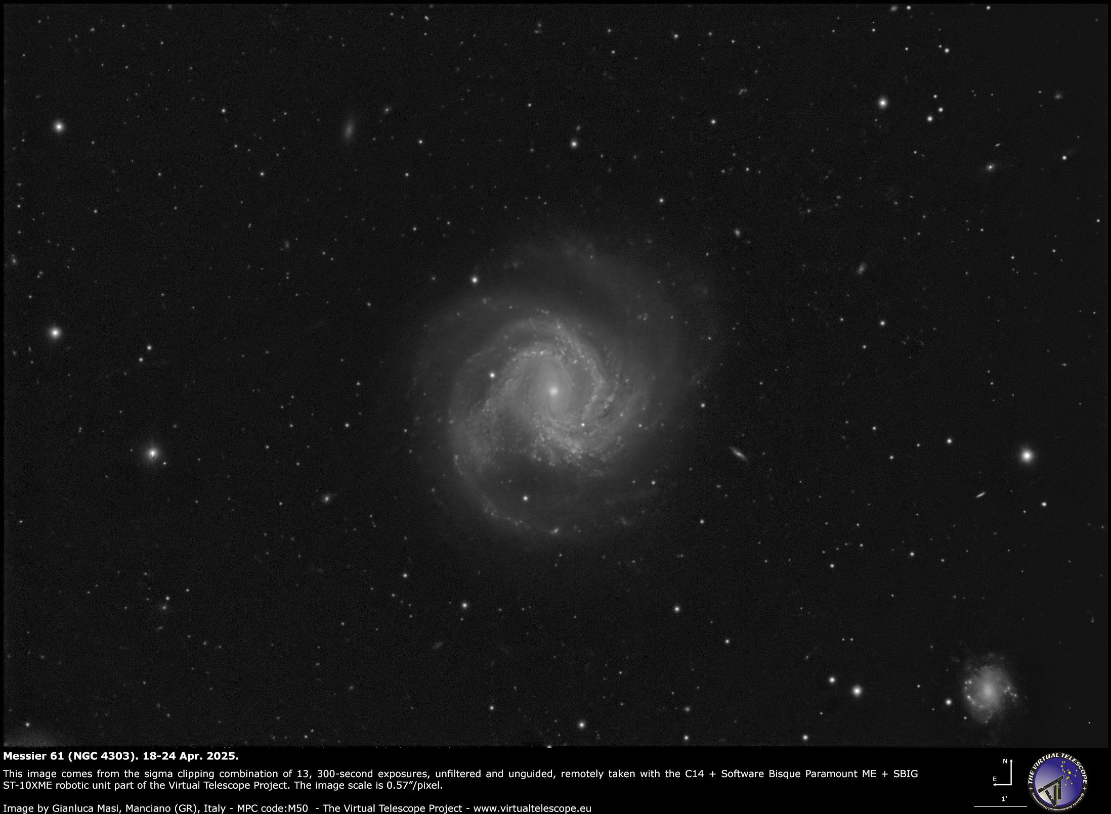What you see in this image is Messier 61 (M 61), a spectacular barred spiral galaxy, captured last spring with the Celestron C14+Paramount ME+SBIG ST-10XME robotic unit available as part of the Virtual Telescope Project facility in Manciano, Italy.