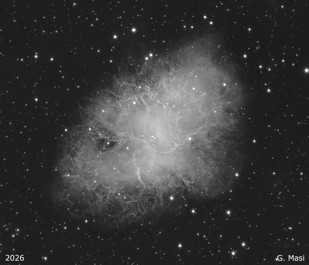 The “Crab Nebula“, cataloged as Messier 1 (M 1) and NGC 1952, is one of the most studied and famous supernova remnants in the sky. Located in the constellation Taurus about 6,500 light-years from Earth, it is the remnant of an explosion observed in 1054 AD by Chinese and Arab astronomers. At its center lies a neutron star, an extremely dense and rapidly rotating pulsar that emits regular pulses of radiation and powers the entire nebula.